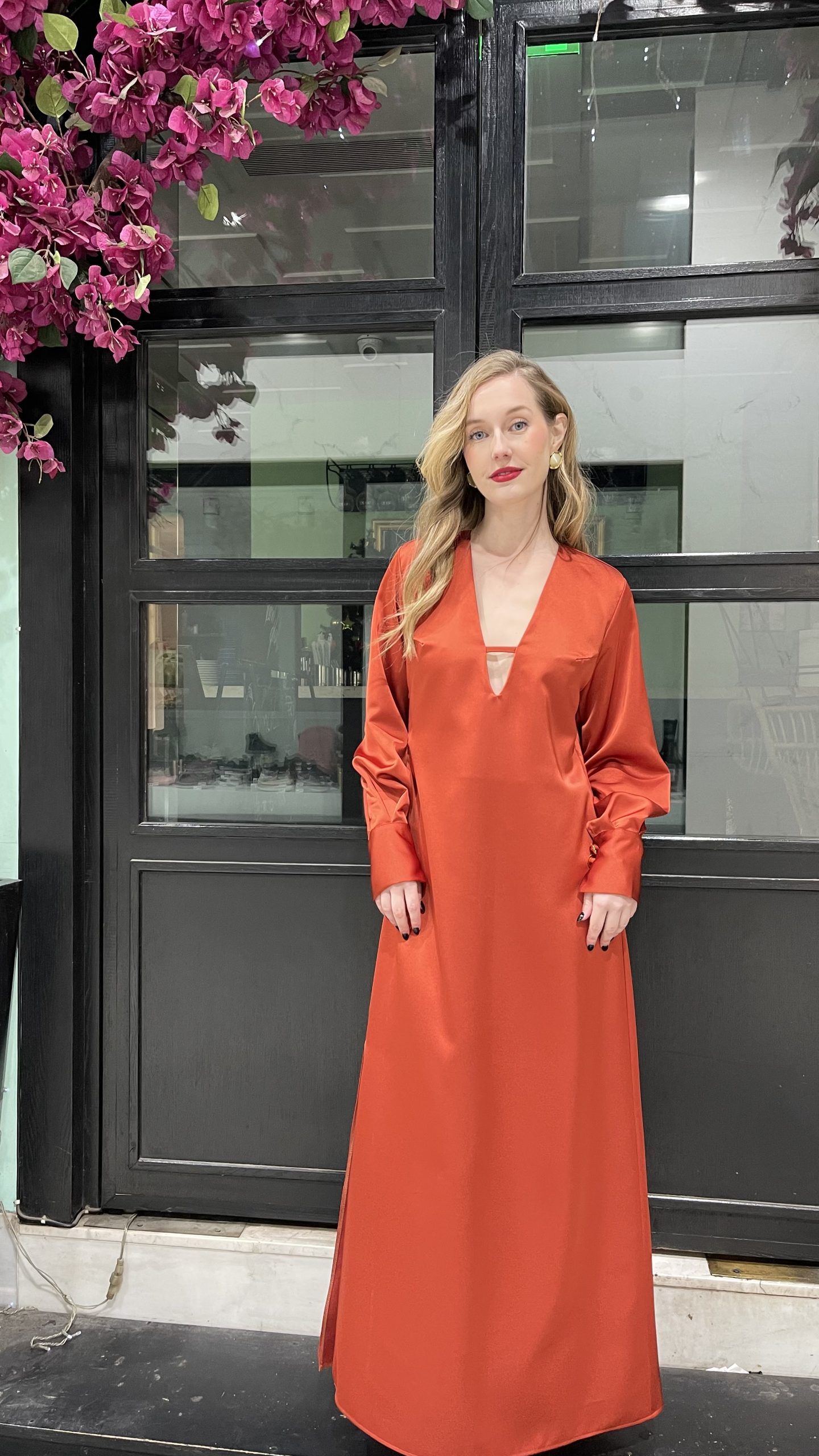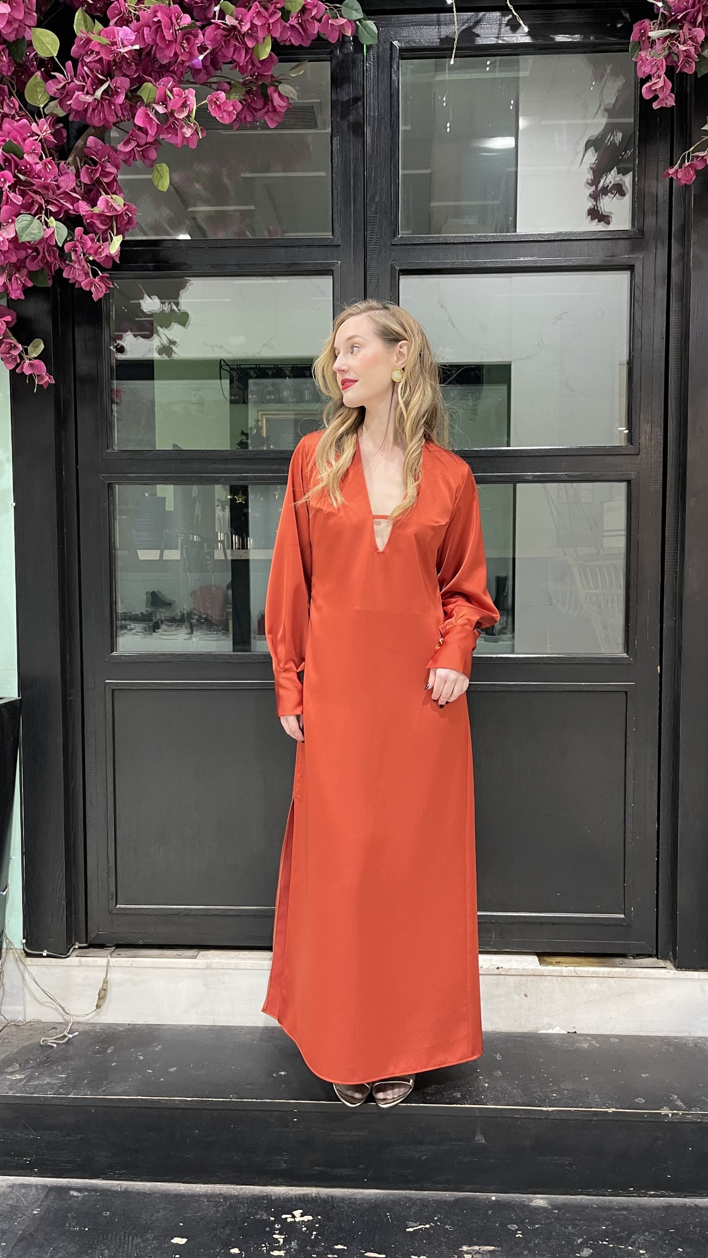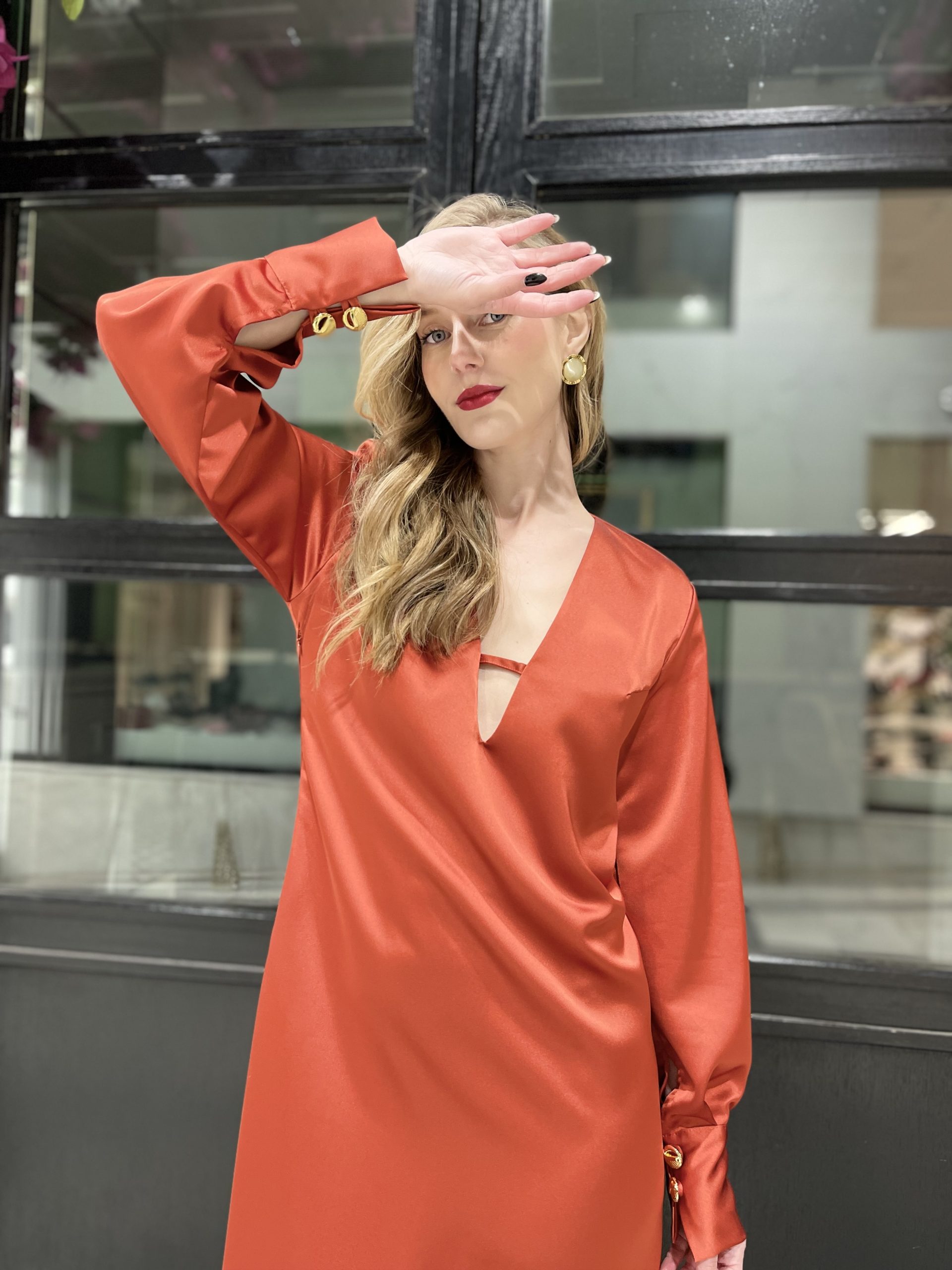 • Φόρεμα σε άλφα γραμμή με άνοιγμα στο στήθος ,φαρδιά μανίκια με κουμπιά χρυσά
